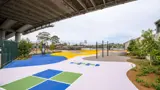Designed by OCULUS and delivered by Regal Innovations on behalf of Infrastructure NSW, it includes a basketball half-court, outdoor fitness equipment, handball court, shaded areas to sit and relax and scooter paths for children to enjoy.